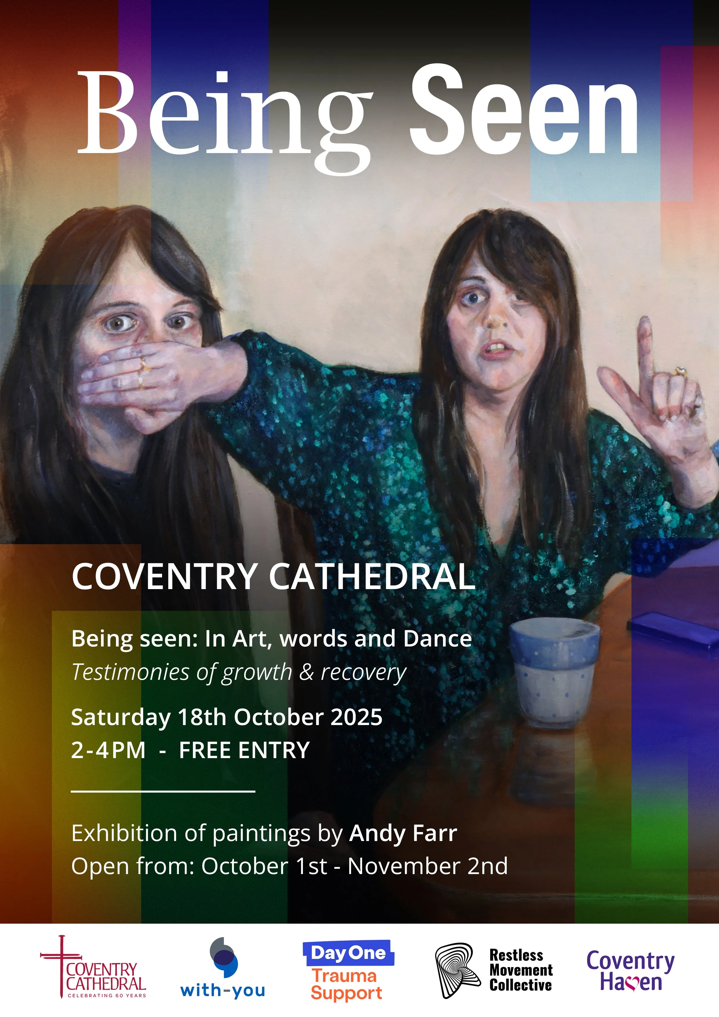 Coventry Cathedral presents "Being Seen: In Art, Words and Dance," an event and exhibition about recovering visibility after trauma. It features paintings by local artist Andy Farr, inspired by trauma survivors, along with dance, poetry, and personal stories to show healing and strength.